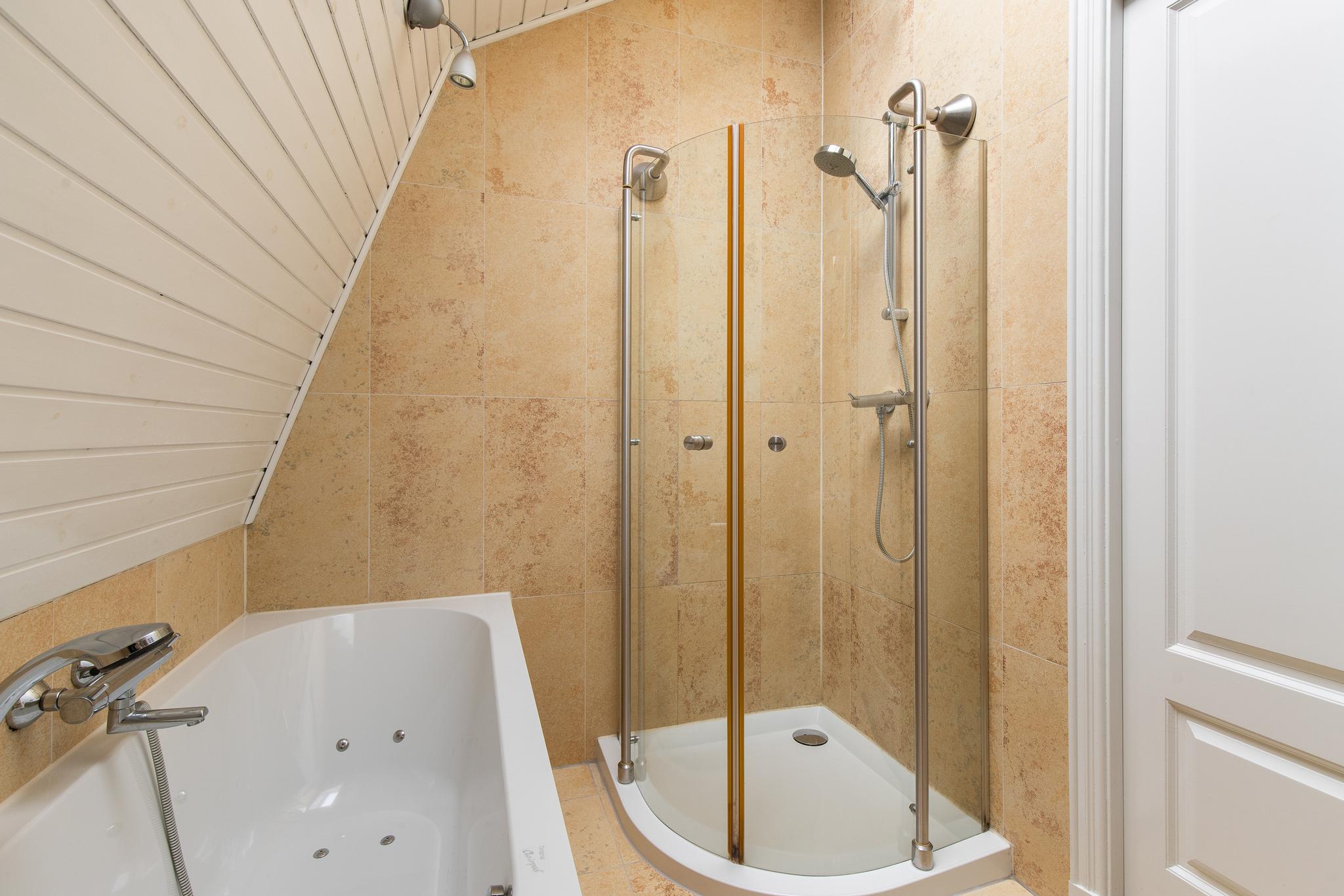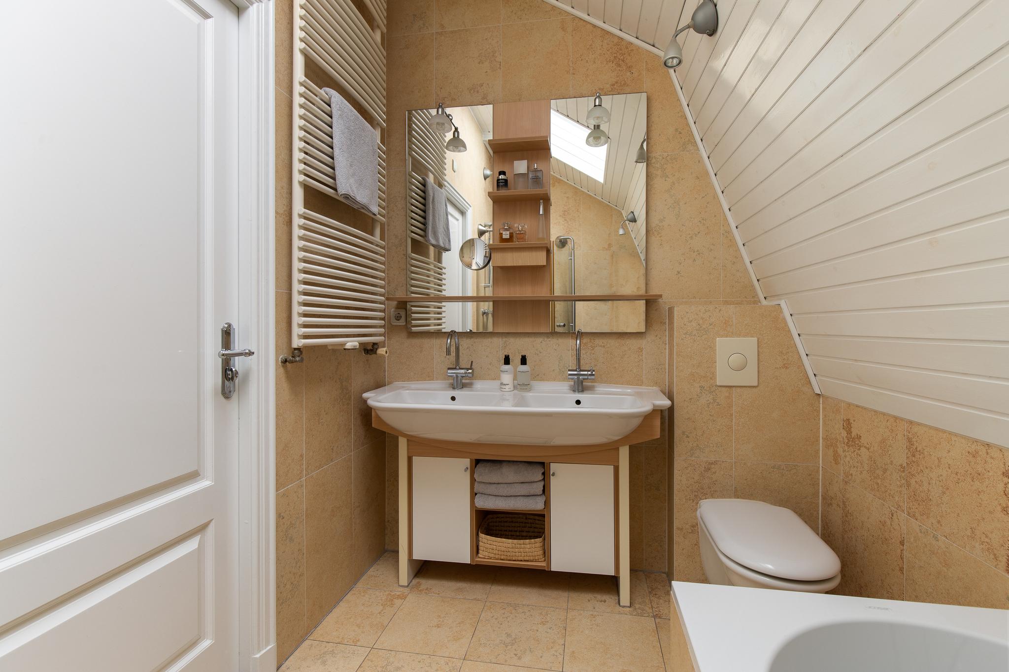 The two bedrooms with fitted wardrobes and skylights are located on the fourth floor. The spacious bathroom has a shower, double sink and bathtub.
