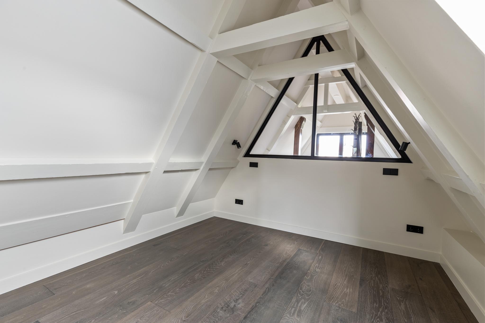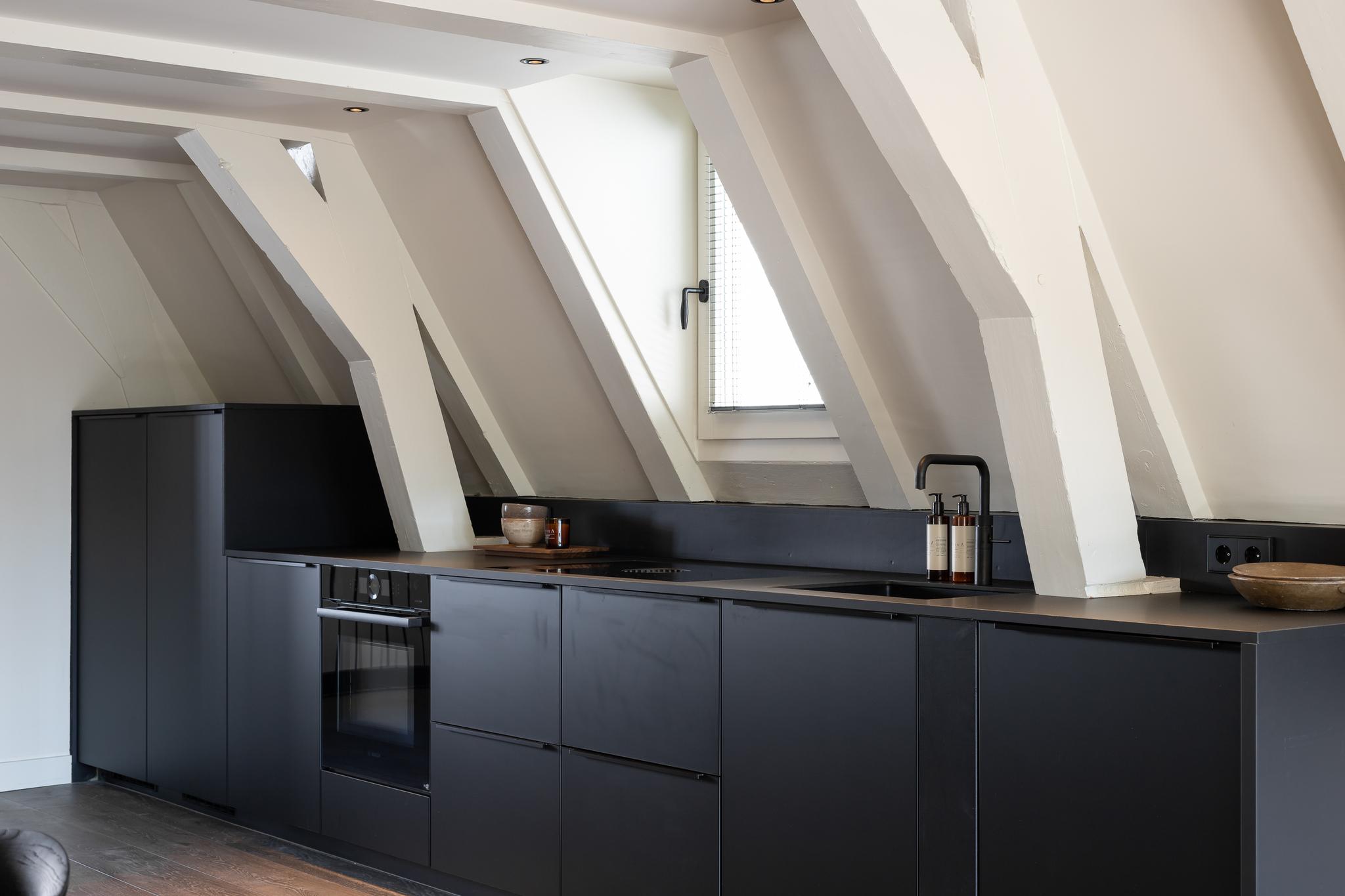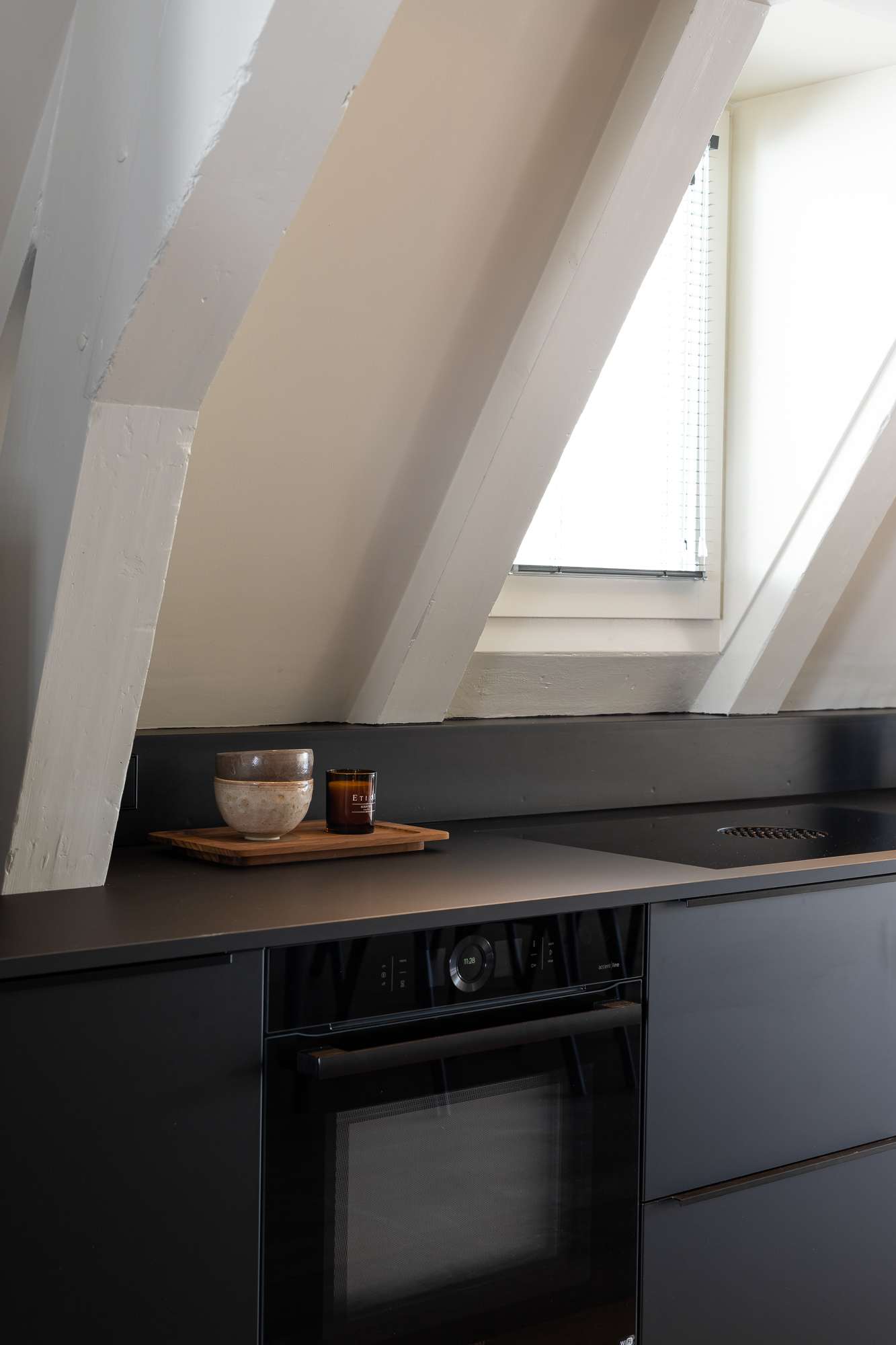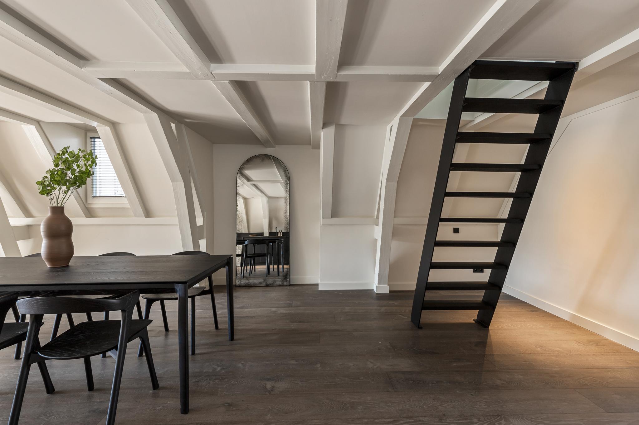 Split over the third and fourth floor, this beautifully renovated 94.9 m2 apartment is accessed from the second floor via a private staircase. On the lower floor there is a luxury kitchen and living space with a gas fireplace and original benches by the windows at the front overlooking the canal – perfect for watching the world go by.