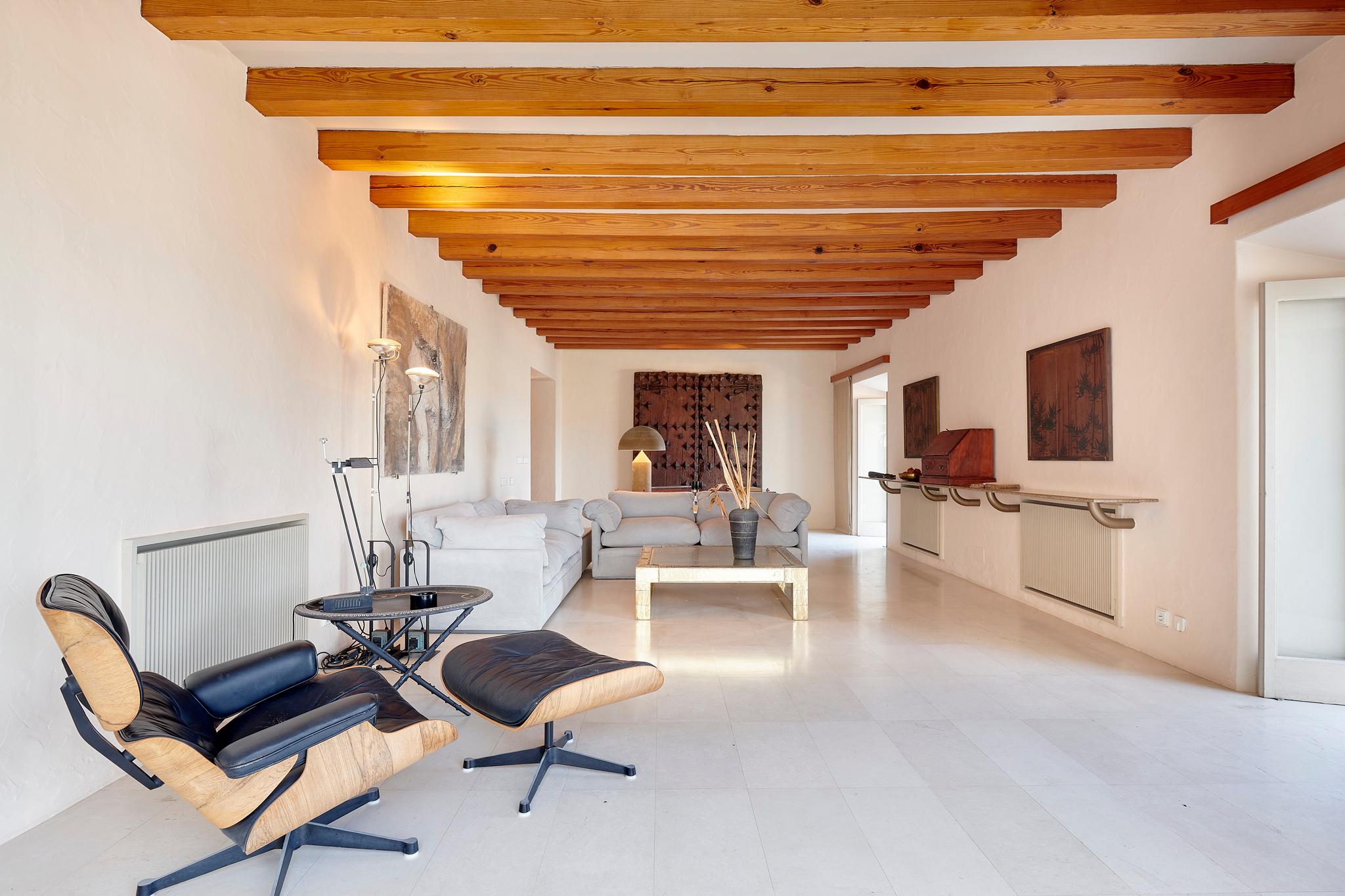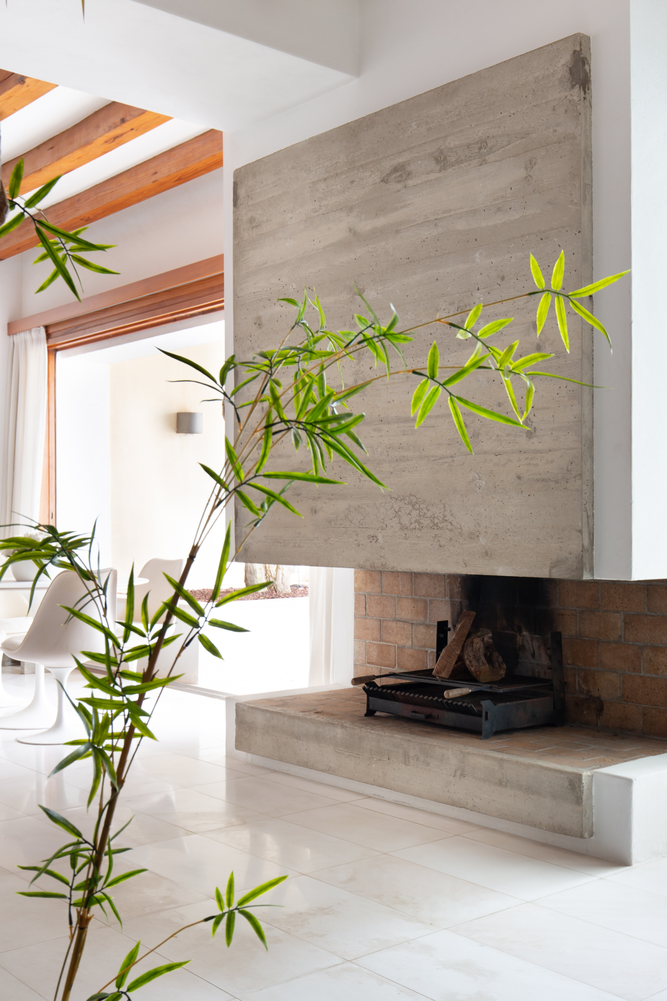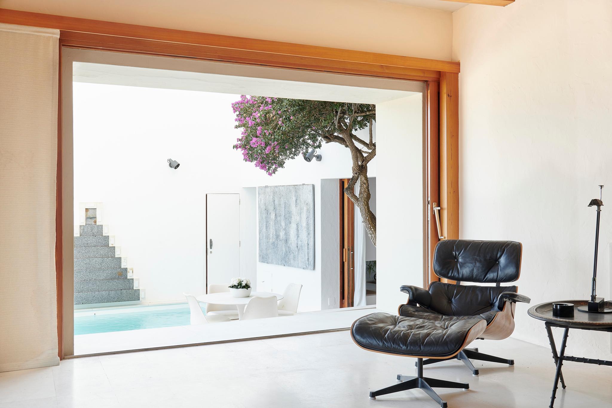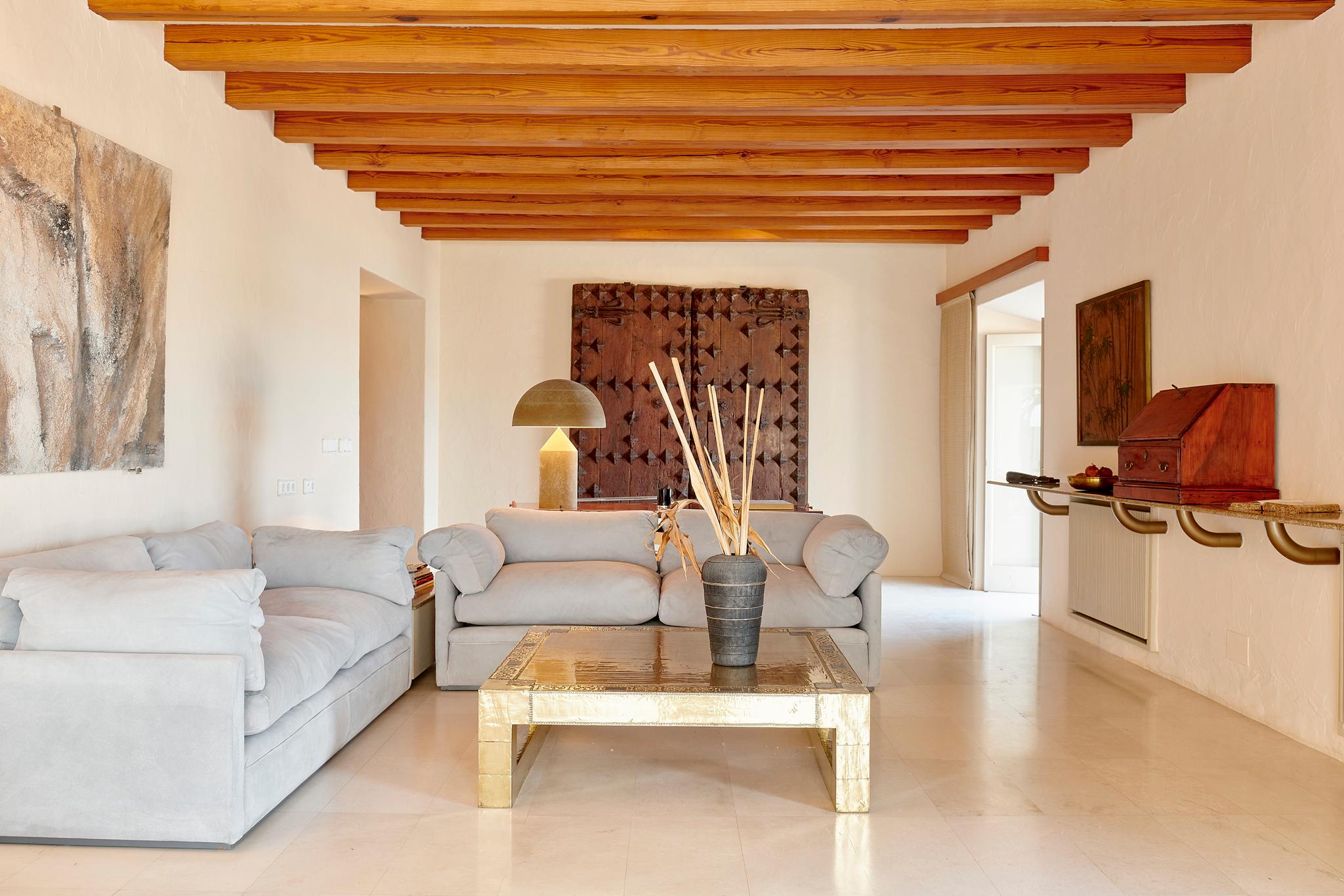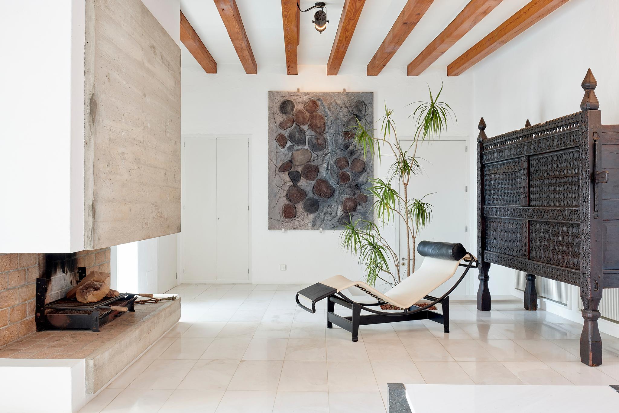 Step off the cobbled street and into a grand hallway where arches chiselled by the same Genovese craftsmen who left their mark on Ibiza’s Town Hall have been sympathetically preserved. Staircases forged into concrete and ancient wood that runs along the ceiling. Two reception rooms, where smooth concrete and timber accents amplify the flow of space, are bright and airy thanks to their seamless connection with the outdoors. Note the traditional forms that are scattered throughout the cleverly interconnected rooms; an old wine press, an Indian-inspired armoire and a Castilian door.