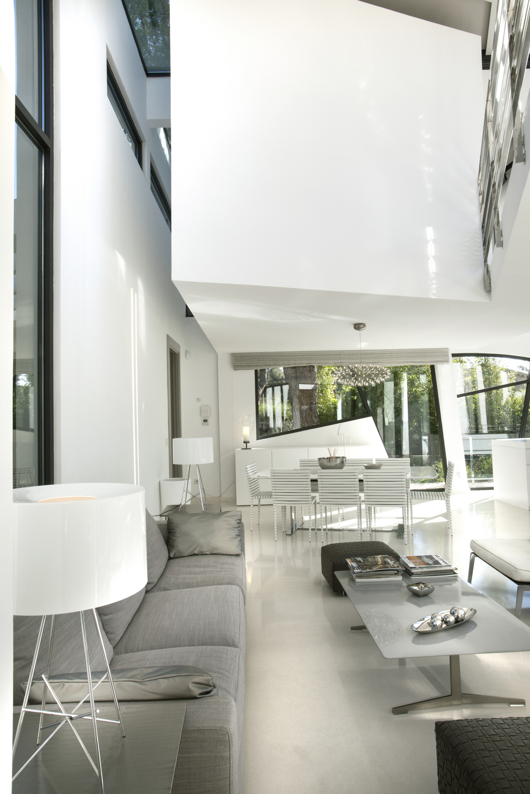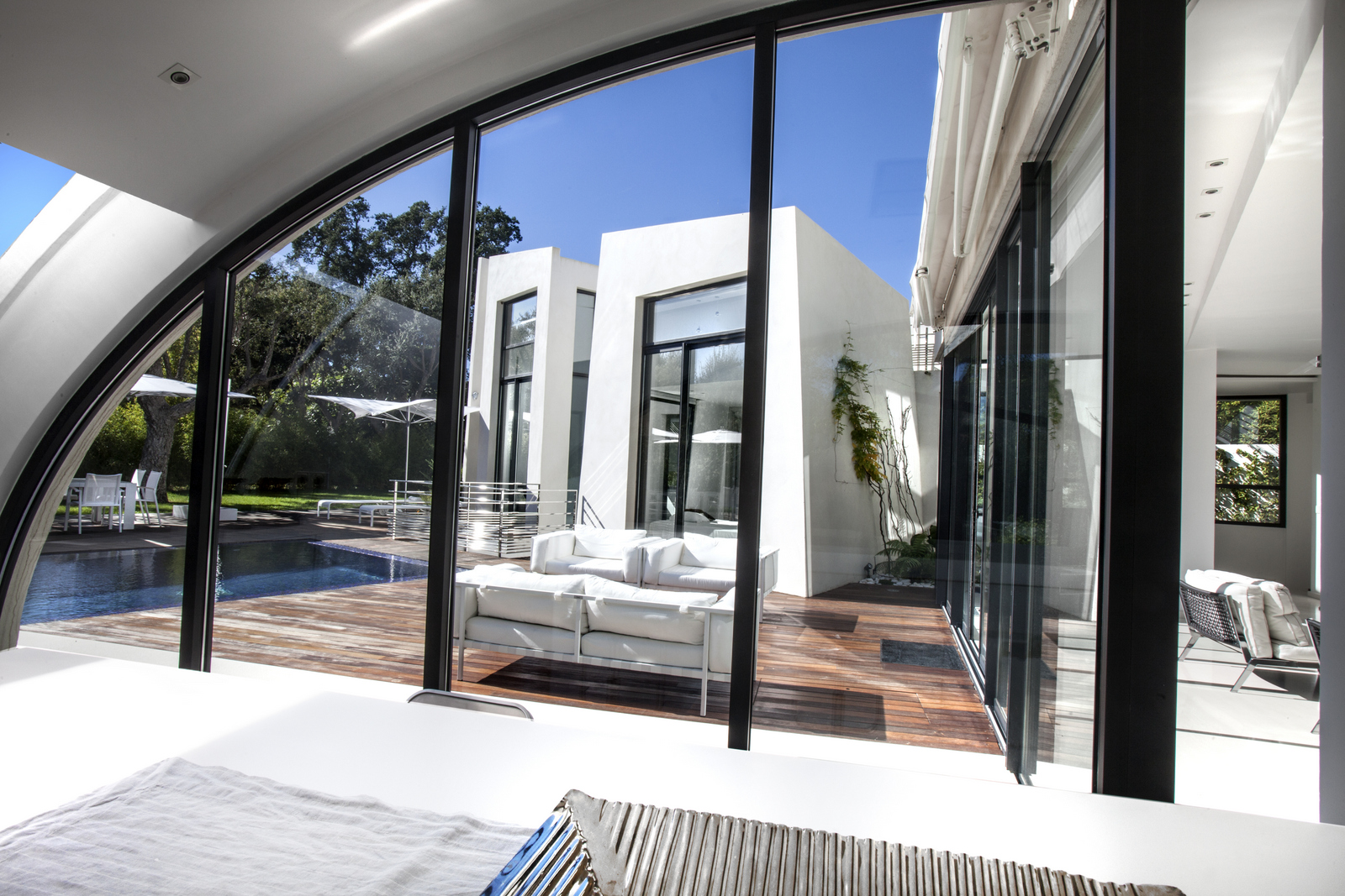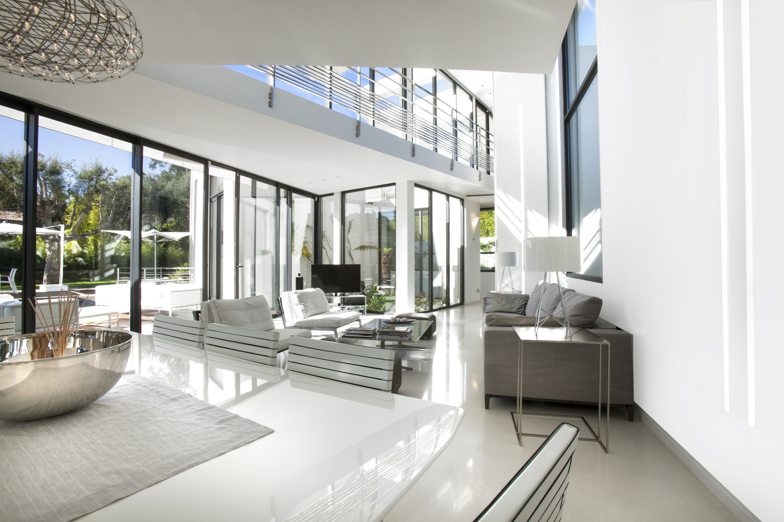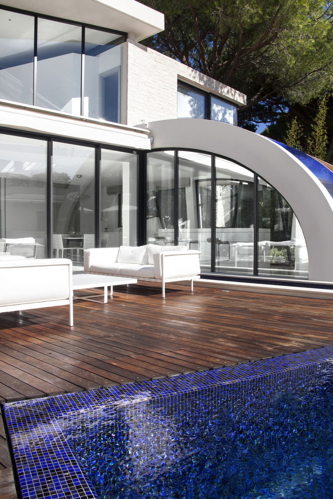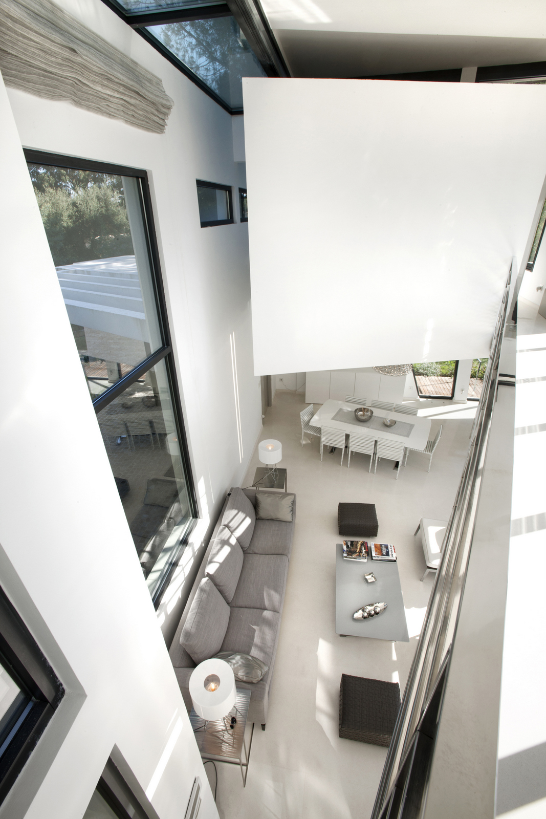 Large windows allow natural lighting to enter the villa, which creates a more spacious feeling that connects the outside terrace with the inside area.