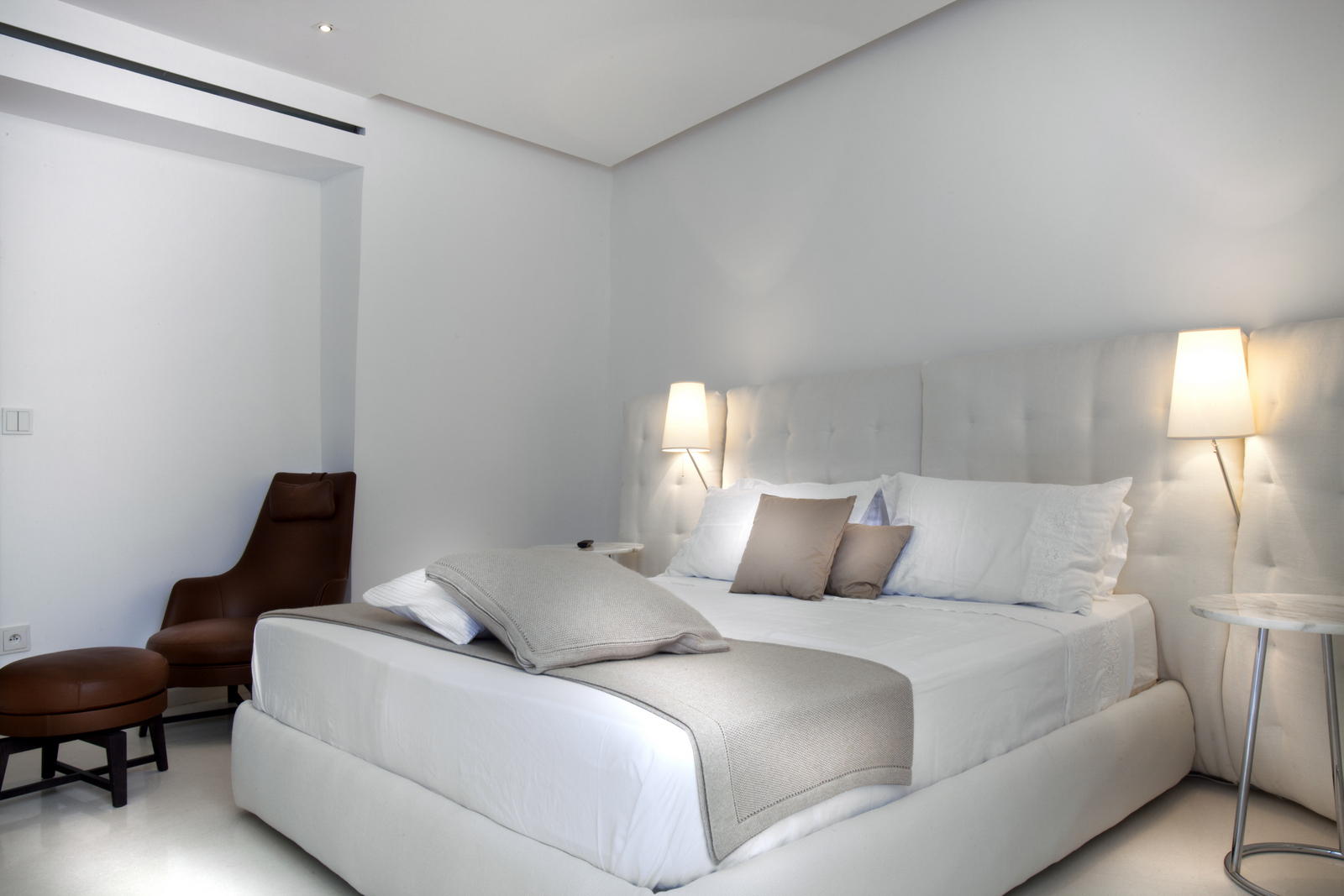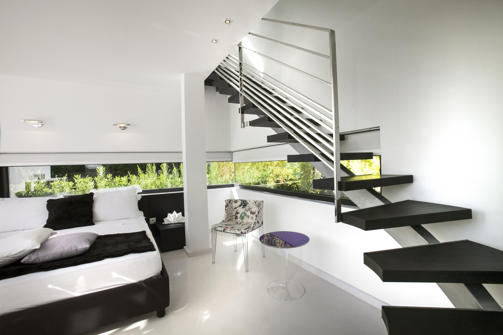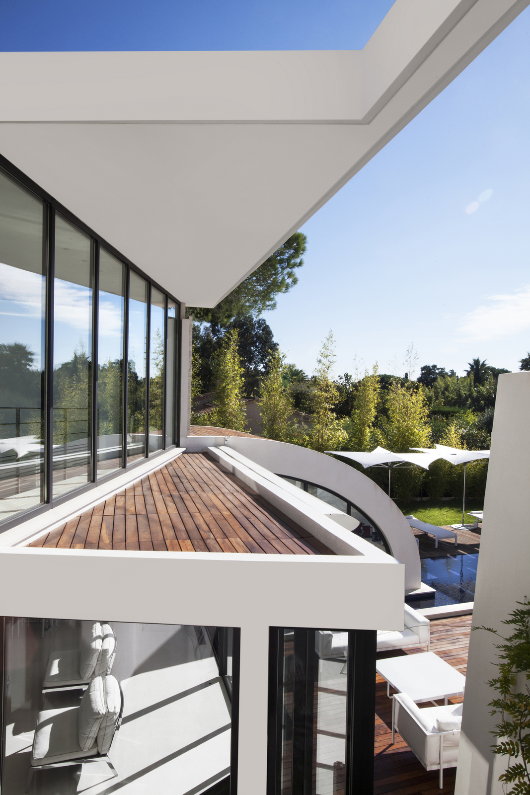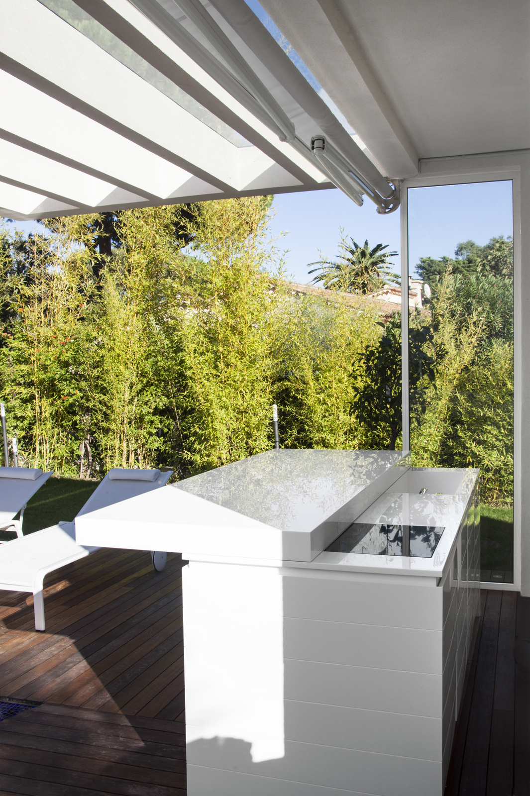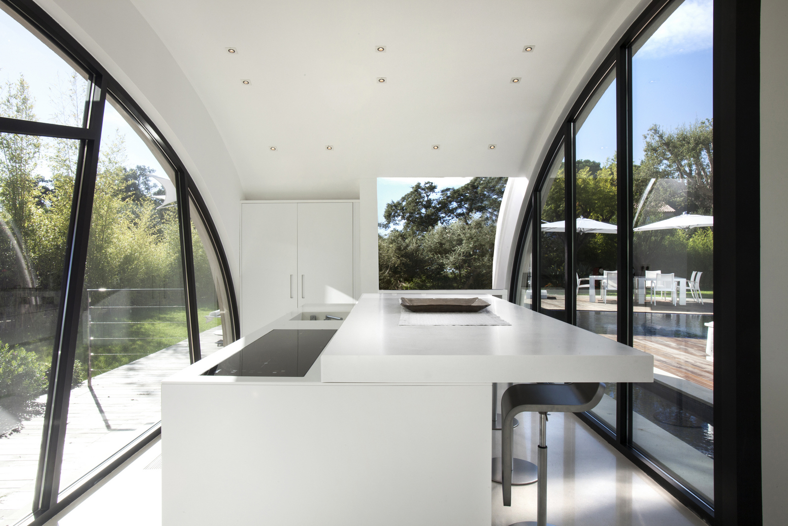 Large windows allow natural lighting to enter the villa, which creates a more spacious feeling that connects the outside terrace with the inside area.